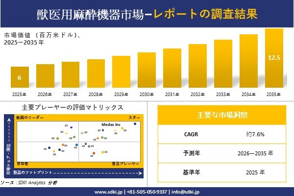 SDKI Analytics(本社:東京都渋谷区)は、このたび、2026年04月22に「獣医用麻酔機器市場調査レポート:2026-2035年の市場規模、シェア、傾向の予測」を発表しました。獣医用麻酔機器に関する市場調査レポートには、統計的および分析的アプローチを使用した予測評価が含まれています。この調査レポートでは、一次および二次調査方法を使用して分析された主要な業界洞察を通じて将来の傾向を理解できるようにすることで、主要な市場動向を読者に説明しています。