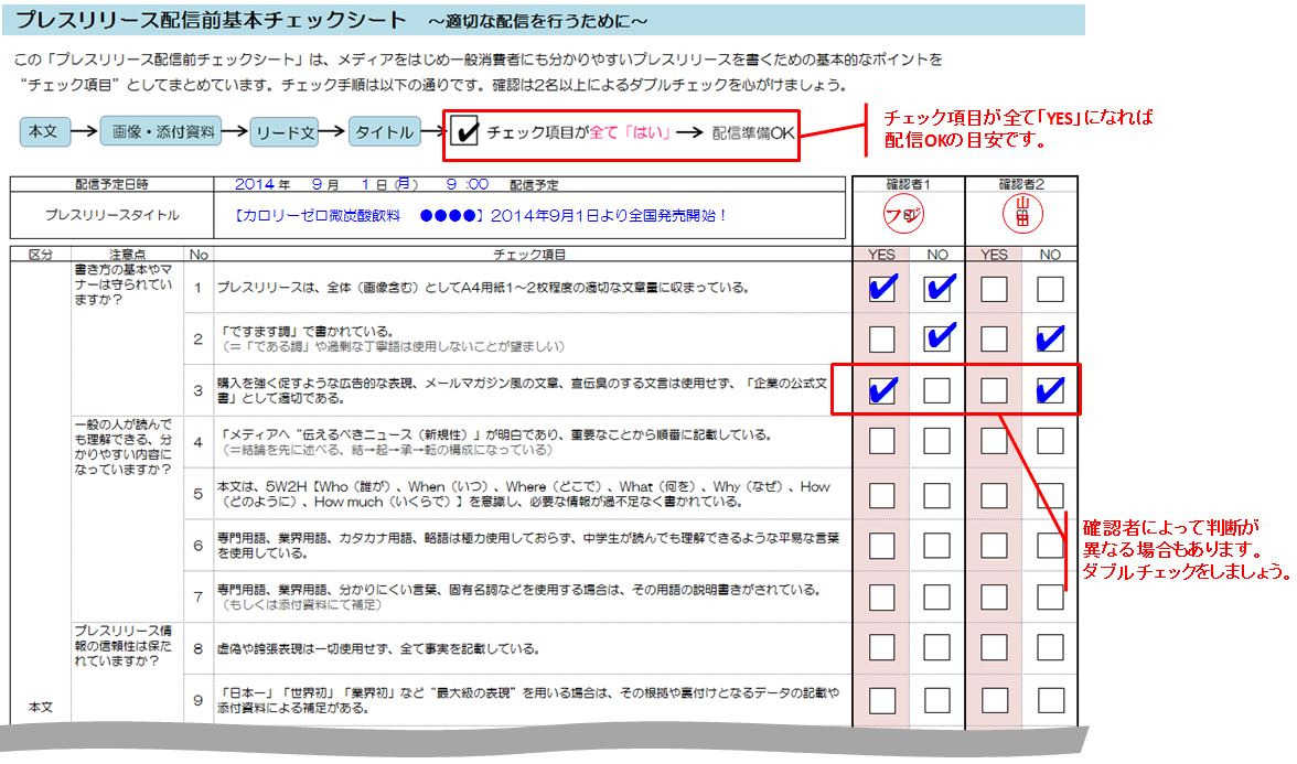 メディアをはじめ一般消費者にも分かりやすいプレスリリースを書くための基本的なポイントを“チェック項目”としてまとめています。