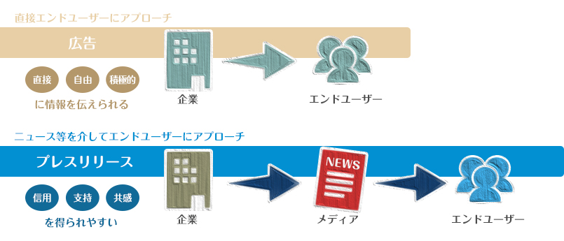 一方、プレスリリースは、メディアにニュースとして取り上げられることを目的として企業の情報を提供(いわゆる広報活動)する代表的手法となります。そのため、プレスリリースでは、消費者に対し直接商品の購入を呼びかけるような広告的フレーズの使用はご法度です。