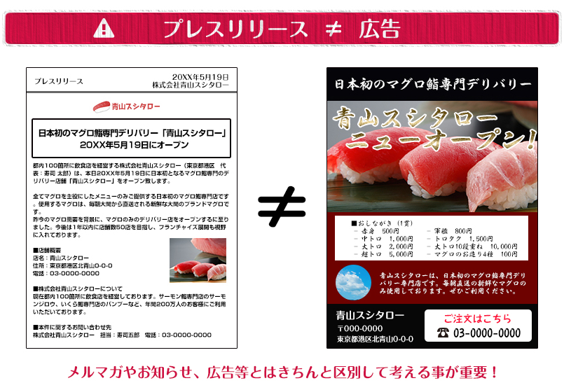 また、“季節のご挨拶”や“発信者の主張や考えをまとめた“読み物”など、単なる「お知らせ」や「メルマガ」と捉えられるものもプレスリリースとしては不適切です。