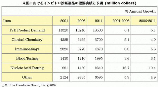 米国におけるインビトロ診断製品市場は、今後年間で5.1%成長し、2011年には200億米ドル規模に達すると予測されています。インビトロ診断(IVD)の分野では、今後も臨床化学および免疫測定による検査法が主なインビトロ診断手法として留まると予測されています。前者は主に血中グルコースの自己測定ストリップの販売動向から、後者は高付加価値のケミルミネッセント製品の医薬品・感染症検査市場への普及動向から、こういった予測がなされています。また、スループット、精度、スピード上のメリットから、核酸テスト製品が特に感染症の検出や癌マーカーの分野で急速に利益を生んでいくと考えられています。さらに、糖尿病患者による血中グルコースの自己測定が普及する影響を受け、インビトロ診断の最大のアプリケーションは内分泌検査となるでしょう。これらの動向は、当報告書に掲載されています。