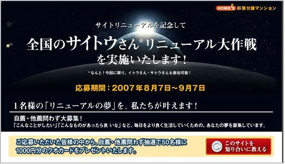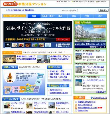 住宅・不動産情報ポータルサイト「HOME'S」を運営する株式会社ネクスト(本社:東京都中央区、代表取締役社長:井上高志、東証マザーズ:2120)は、このたび、新築分譲マンションポータルサイト「HOME'S新築分譲マンション」の全面リニューアルを実施いたしました。 また、リニューアルを記念して、2007年8月7日(火)~9月7日(金)までの期間で、『全国のサイトウさん リニューアル大作戦』キャンペーンを実施いたします。