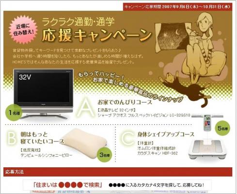「HOME'S賃貸」の物件検索フロー中に隠されたキーワードを見つけてご応募いただくと、抽選で"おうちでのんびりコース"として「液晶テレビ32インチ『シャープ アクオス フルスペックハイビジョン LC-32GS10』」を1名様に、"朝はもっと寝ていたいコース"として「低反発枕 『テンピュール シンフォニーピロー』」を3名様に、"身体シェイプアップコース"として「体重計『オムロン体重体組成計カラダスキャン』」を5名様にプレゼントいたします。