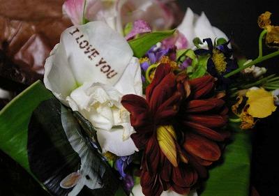 メッセージやイラスト、写真などが印刷された透明皮膜シール(弊社標準)を花に貼ると