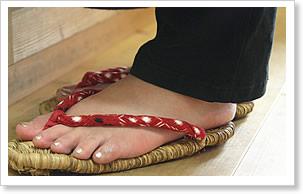 鼻緒の履き物が外反母趾の予防にも役立つという事で見直されていますが、竹皮健康ぞうりはワラぞうりの様に履いて歩いた時にゴミが落ちず、耐久性に優れ、水にも強いという特徴がありフローリングなどの室内でのスリッパ代わりに愛用される