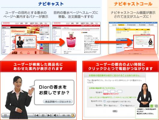 顧客が目的の商品ページへたどり着けるよう効率よく誘導することのできる誘導型LPO*サービス「ナビキャスト」と、顧客とネットショップ運営者側との電話を仲介してつなぐコールバック機能を利用した電話サポート「ナビキャストコール」の2つの機能となります。