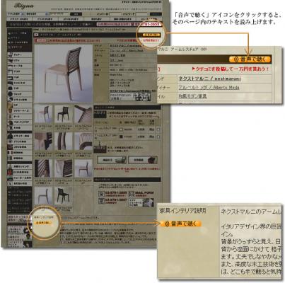 アビリタ株式会社(以下、アビリタ 本社:東京都港区 代表取締役社長:小澤良介)と、リードスピーカー・ジャパン株式会社(以下、RSJ 本社:東京都千代田区 代表取締役社長:太田光昭)は2007年11月7日、アビリタが運営するデザイナーズ家具専門ECサイト「リグナ」( http://www.rigna.com/ )に、WEBサイトのテキスト情報を、ワンクリックで音声にて読み上げる『リードスピーカーSay It(RSJ製)』を、EC業界初の試みとして導入しました。