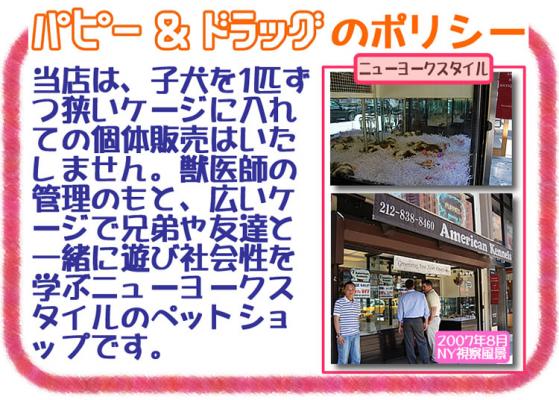 パピーたちは、当店の特徴であるニューヨークスタイルの広いゲージの中で、兄弟や友達と一緒に伸び伸びとストレス無く元気に過ごしております。