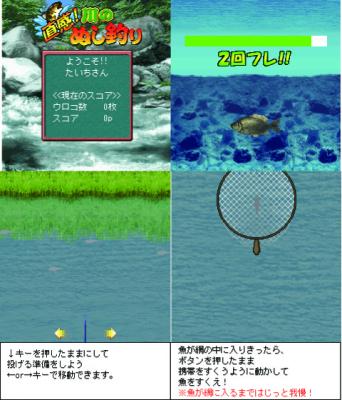 今作の「直感!川のぬし釣り」では、DoCoMoのケータイを「かたむける」「ふる」、またはケータイを「手をかざす」「体を動かす」という直感ゲーム機能をフルに活用し、キャスティングやHIT!の表示が出た時、リールを巻く、網ですくうなど直感ゲーム対応の要素が満載で、臨場感たっぷりのぬし釣りゲームをお部屋の中などで味わう事ができます。