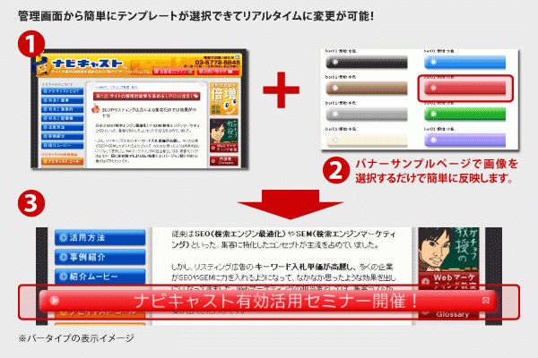 もちろん、従来の「ナビキャスト」の特長である、「検索キーワード連動」「エリア連動」「スケジュール予約」「リンク元連動判別」などは、そのまま併用可能です。