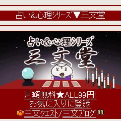 オーソドックスな占いからユニークな診断系まで、数々のFlashを取り揃えた「占い&心理シリース゛▼三文堂」。価格は一つ99円と格安で配信しています。心理テストや診断系・占い以外にも依存度チェックなどもできます。