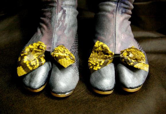作品は、すべて本物の地下足袋(*1)や作業用手袋に、MAYUMI HASEGAWAのデザイナー長谷川真弓氏