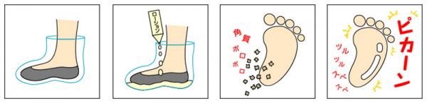 『ベビーフット』は天然の木酢液という炭から抽出する酸性のローションで、使い方は簡単!足を2時間ほど湿布みたいにつけておくだけ。2時間たって洗い流しそのまま放っておくと、不思議なことに1週間くらい経って忘れかけた頃に、日焼けして皮がむける時みたいにボロボロと足の裏の角質がむけていくのです。あんまりボロボロ剥けるので、驚きますが、足裏に残っている古い角質が植物酸によって刺激されてターンオーバー(皮膚の生まれ変わり)とともに無理なく剥けていくから、心配はいりません。