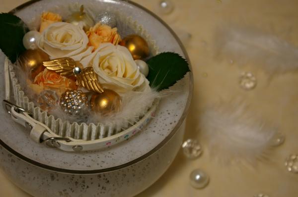 付属のオリジナルガラス骨壷エテルノは、蓋をトレー形状にすることで、首輪などの愛用品やプリザーブドフラワーをのせて飾ることが出来ます。