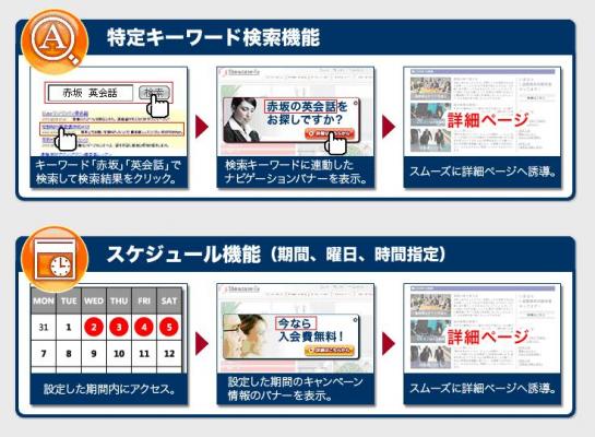 「ナビキャストTM」はお客様のWebサイトにアクセスしてきたユーザごとに、最適なバナーや動画を自動切り替えで表示させるASPサービスです。(今回、リクルートエージェント様には大規模サイトのため、サーバインストール型で導入されています)。