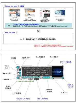 Real LifeとSecond lifeを(Webを介して)相互接続すると共に、インタラクティブなグラフィック広告配信システムを搭載しております。情報配信はRSSをベースとして いるため既存のWebシステムを変更することなく、最新の情報や広告をマスメディアと疎遠になりがちな“Second Lifeユーザ”へ“ダイレクト”配信することが可能です。