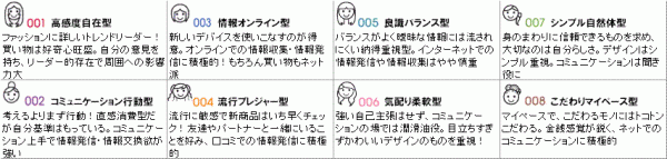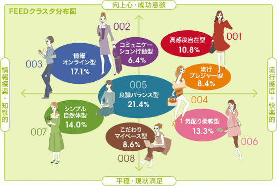 今回の調査は首都圏・京阪神在住の1968年~1985年生まれ(2008年現在23歳~40歳)のインフルエンス機能の高い子供のいない有職女性(FEEDでは彼女達をF1ダッシュ層と定義いたしました)を調査対象とし、彼女達を8つのクラスタに分類し分析を行いました。 IMJが独自調査によって分類した8つのクラスタ(FEEDクラスタ)は以下の通りです。