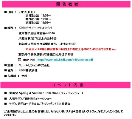 ショーでモデルが着用したアイテムは、その日中に抽選を行いサイト上で当選発表、ご来場のお客様にプレゼントさせていただきます。抽選結果に関わらず、ご来場いただけました方にはオリジナルの恋愛占いストラップや人気トップスなどのプレゼントをご用意いたしております。