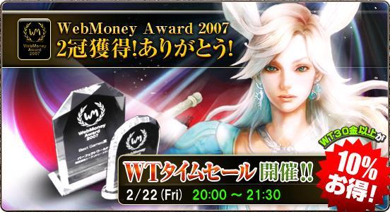 グランプリこそ逃してしまいましたが、みなさまの熱い一票で2冠を獲得することができました。 そこで、感謝の意をこめまして「WebMoney Award 2007・2冠受賞記念・WTタイムセール」を実施 いたします!