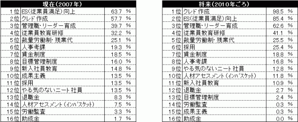 さらに、今後、重要視される項目では、採用に関する人事施策項目が、注目を浴びてくるでしょう。1000名以下の企業の有効求人倍率が、4.22倍(2008年3月卒)というデータからもその関心の高さが伺えます。逆に低下傾向にある項目としては、目標管理や、成果主義などの項目です。一頃の成果主義、実力主義の人事制度のブームが終焉を向かえ、リストラのための人事施策からシナジーを生み出す人事施策へと大きく舵を切る段階が、やって来るでしょう。