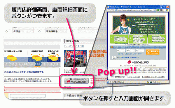 1. 掲載車両の詳細画面、または販売店の紹介画面から「WebCalling」のボタンをクリックして下さい。2. 電話番号を入力して「電話する」ボタンをクリックして下さい。(注:入力された番号は販売店には伝わりません)