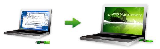 FogosPRO専用の指紋認証機能(またはパスワード認証機能)付きUSBメモリを、既存のWindows PC(自宅や出張先のパソコン)に差し込んで使用します。FogosPRO専用USBメモリの指紋認証に成功すると、利用中のWindows PCが、リブートすることなく、セキュアな仮想シンクライアント環境FogosPRO Mobile Desktopに切り替わります。