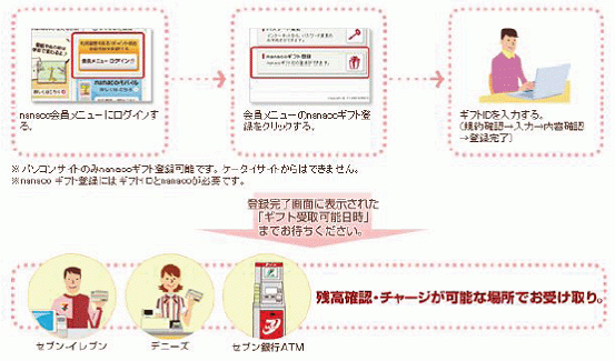 プレゼンターから「nanacoギフト」を受取られた方は、贈られた「nanacoギフトID」と、お手持ちの「nanaco」番号をパソコンから「nanaco」ホームページに登録し、セブン-イレブン、デニーズのレジカウンター及びセブン銀行ATMにおいて残高確認または、チャージをすると、「nanacoギフト」相当額の電子マネーをチャージする(受取る)ことができます。