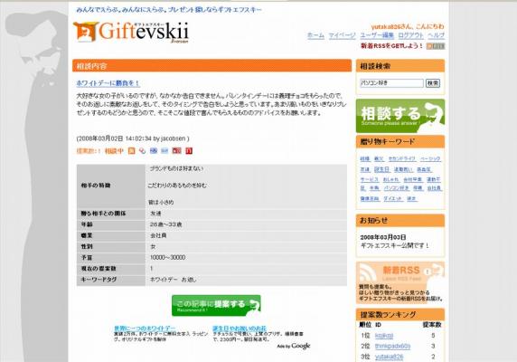 サービス利用は無料。質問者はギフトを贈るシチュエーションと共に、贈りたい相手の属性や予算などを登録することで、その内容がサイト上に公開されます。回答者はそれを見て、商品データベースから質問者の要望にマッチした商品を検索し、提案をすることができます。