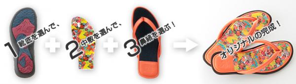 1.ソール(靴底:男女各6色)、2.アッパー(鼻緒:全15種)、3.和紙(中敷:全34種)をそれぞれ1点ずつお選びください。 3000を超える組み合わせの中から、あなたオリジナルのサンダルをお作りいたします。