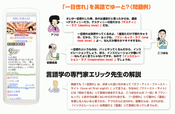 英語ダメ社員3人(アフロ、こつぼね、窓際係長)の典型的な日本人英語は、ゆるゆる研究所が独自に調査した平均的な日本人(約100人分)の回答データを元にして作成されており、日本人の平均的な英語力が外国人にどれぐらい伝わるかパーセンテンジ形式で判定されます。しかも、言語学の専門家エリック先生の詳しい解説付きなので、楽しみながら知らないうちに英語力がアップするかもしれません。