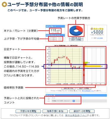 外国為替証拠金取引にて資産運用を行ってる不特定多数の投資家に、米ドル/円の週末レートを予測・投稿してもらい、投稿してもらった予測レートを即時集計・予測分布図として投資判断材料を提供するサービスです。