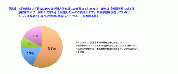 ⇒現在、英語学習を行っていない、もしくは辞めてしまった理由については、「忙しくて時間がないから」(57%)がトップで、「おもしろい教材やテキスト、サイトがないから」(17%)、「その他」(17%)と続く。今回の回答者の約70%が会社員ということもあり、現代の会社員の忙しさが露呈した結果になりました。