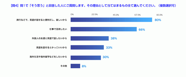 ★英語が話せるようになりたいと思う理由は、「旅行」(80%)と「仕事」(66%)で使いたいから。英語学習経験者の5人に1人が、「英会話学校」の通学経験あり
