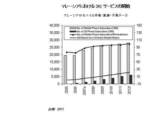 マレーシアのモバイル市場は成熟化に近づきつつあるため、この市場での成功はかなり厳しい挑戦と言えるでしょう。しかし、2007年末のモバイル普及率は88%という状況ではあるものの、依然として成長の余地は残されています。BMI(Business Monitor International)の推計によれば、2007年末における3G加入者数は市場全体のわずか5.6%に過ぎません。同社はモバイル普及率が100%に達すると考えられる2012年までに、この数字は21.5%へと拡大すると予測しています。市場の全体的な成長速度が鈍化していることから、オペレーター各社は収益拡大に向け、ますます3Gに期待を寄せています。