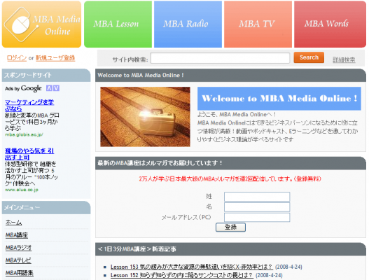加えて、アップル社の提供するiTuneのPodcastingで長い間経営/マーケティング部門で1位を独走する人気インターネットラジオ番組『1日3分MBA講座@MBA Radio Station』での音声MBA講座やトップMBAホルダーによる無料の動画セミナーも提供しています。