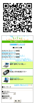 「モノチェンモバイル」へのアクセスは携帯電話で右記QRコードをバーコードリーダーで読み取っていただくか、直接URL「http://webr.jp/」を入力して下さい。