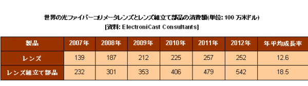 光ファイバー通信業界のコンサルタントを専門とするElectroniCast Consultantsは、このたび、商業光通信用のパッシブコンポーネントやアクティブコンポーネント、統合コンポーネントで使用されるコリメータレンズとレンズ組立て部品の世界市場における消費と技術の動向を分析した新たな調査報告書、"FIBER OPTIC COMMUNICATION COLLIMATOR LENS & LENS ASSEMBLIES GLOBAL MARKET FORECAST 2007-2012" を発表しました。同報告書よると、2007年に光ファイバー用コリメータレンズの消費量(製品で使用されたレンズの数)が最も多かったのは日本/環太平洋地域であり、世界全体の消費量の46.7%を占めています。次に消費量が多いのは、北米(メキシコ、カナダ、米国)地域で、全体の37.9%を占め、欧州地域は15%弱となっています。欧州の光ファイバーコンポーネントメーカーは、ほとんどが生産拠点を他の地域に移しているため(主としてアウトソーシングによる)、今後も消費量は横ばい状態で推移すると思われます。消費量は、レンズがより高いレベルのサブコンポーネントやコンポーネントで最初に使われた地理的な場所(地域)ごとに集計されるため、ElectroniCastでは、日本/環太平洋地域における消費量の増加傾向は今後も続くと予想しています。