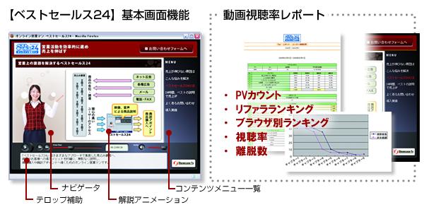 ベストセールス24はナビゲータの映像と説明プレゼンテーション動画を組み合わせたFlash映像コンテンツです。説明画面に合わせてナビゲータがナレーションを行うスタイルで、PIP(Person In Presentation)とも呼ばれています。テキストや画像だけでは不足していた商品説明が音声と映像により説得力のあるプレゼンテーションを実現させます。