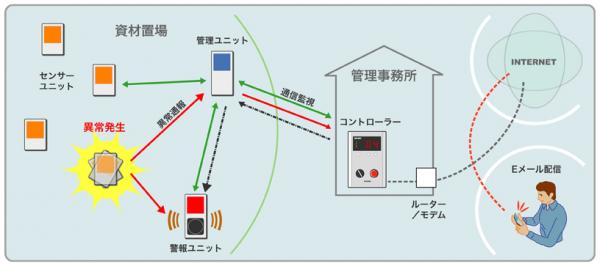 建築現場にある電線等、盗難のおそれのあるものにセンサーユニットを取り付けることによって、センサーユニット内に装備した3D加速度センサーが盗難行為から生じる移動距離を異常として検知し、警報ユニットに異常を知らせることで警報を発します。また、コントローラーに異常を知らせることでインターネット回線を使用して携帯電話等にEメールで通知します。本システムは各ユニットとコントローラー間の無線双方向通信を可能にしています。
