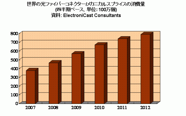 光ファイバー通信業界におけるコンサルタント業務が専門のElectroniCast Consultantsは、このたび、通信用途で使用される光ファイバーコネクターとメカニカルスプライスの世界市場における消費と技術のトレンドを予測した最新の調査報告書 "FIBER OPTIC CONNECTOR & MECHANICAL SPLICE GLOBAL MARKET FORECAST 2007-2012" を発表しました。それによると、昨年の世界市場における光ファイバーコネクターとメカニカルスプライスの消費量は3億7,860万個で、2006年の3億500万個から大幅に増えたとのことです。また2012年には、世界全体の消費量が7億9,000万個に達する見通しです。