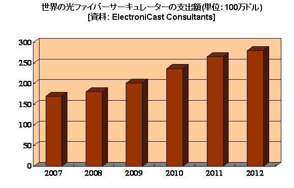 光ファイバー通信業界におけるコンサルタント業務が専門のElectroniCast Consultantsは、このたび、通信用途で使われる光ファイバーサーキュレーターの世界市場における消費と技術のトレンドを予測した最新の調査報告書 "FIBER OPTIC CIRCULATORS GLOBAL MARKET FORECAST 2007-2012" を発表しました。それによると、昨年の世界市場における光ファイバーサーキュレーターの消費額は、1億6,900万ドルに達したといいます。消費額は、2007年から2012年にかけ、年平均10.6%で伸びると予想されており、2012年には2億8,000万ドルに達する見通しです。