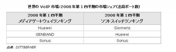 2008年第1四半期、世界のメディアゲートウェイおよびソフトスイッチの出荷量は3,680万ポート(6億1,400万米ドル)を越え、キャリアグレードVoIP機器の世界市場は前年同期比で10%の成長を記録したことが、電気通信産業を専門とする調査、コンサルティングを行っているDITTBERNER Associates Inc.発行による統計資料で分かりました。