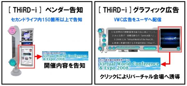 当社は、VWC2008のメディアスポンサーとして、国内唯一の情報配信機能を持つHUD[THiRD-i]のグラフィック広告機能とセカンドライフ内150箇所以上に設置されたデジタルサイネージ(電子看板)機能を有する配布ベンダーを通じて、VWC2008の各種告知・キャンペーンを展開し、仮想世界に対する認知や利用者の拡大に寄与して参ります。