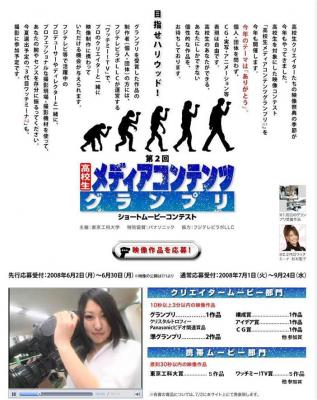 本コンテストは昨年、ハリウッドを目指す高校生たちの祭典として注目を浴びました「高校生メディアコンテンツグランプリ2007( http://www.watchme.tv/e/media-gp/ )」の第2回目となります。今回はより多くの高校生に参加して頂き、映像制作、映像投稿の楽しみを知ってもらう為に、会員登録不要のオープン投稿形式を採用しています。本コンテストでは、本格的な映像作品を募集する「クリエイタームービー部門」と誰でも簡単・気軽に参加できる「携帯ムービー部門」と2部門からになり、部門ごとにそれぞれのテーマで映像投稿を募集します。