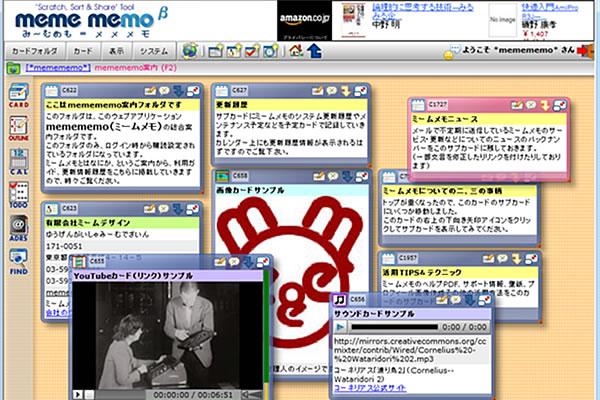 個人のアイデアや買い物リストなどのちょっとしたメモから、住所やスケジュール、画像や動画などのデータファイルまで、ブラウザ画面を自分のデスクトップに模して、付箋を貼る感覚でどんなデータも情報カードにして一元管理するウェブサービス。