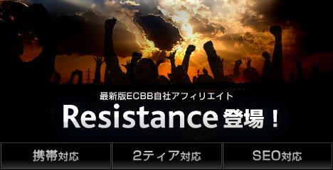 『Resistance(レジスタンス)』[http://ecbb.jp/affiliate/index.html]は、業界最前線のノウハウが結集した自社アフィリエイトシステムです。これからのアフィリエイト成功に必須となる「携帯対応」「2ティア対応」「SEO対応」等の新機能を標準装備し、長期の運用実績からシステムの安定性・堅牢性は高く、スピーディーなサービスインが可能です。