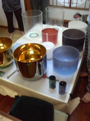 高熱で焼いてクリスタルボウルが作られます。大小さまざまなサイズのボウルをマレットという棒で叩いたり、擦ったり
