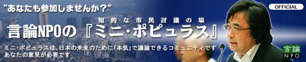『ミニ・ポピュラス(minipopulus)』とは、言論NPOのコンテンツと、ニフティ株式会社が運営するビジネスSNSを連動させた、新しい議論形成型SNSです。インターネットを使った議論の場は数多く存在しますが、匿名性による無責任な発言が数多く見られ、建設的な議論がなされていません。『ミニ・ポピュラス』は、米政治学者のR.ダールの構想で、"市民が主体となる討議の場"を意味します。傍観者的な批判のための発言ではなく、政治を自らの問題として当事者意識を持ち、