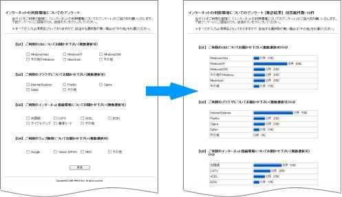 回答データのいろいろな加工や分析が必要な人は、アンケート終了後に連絡をすれば回答データのCSVファイルが送られてくるのでそのデータを使っておこなえる。ホームページ訪問者を対象にしたアンケートに便利な、公開期間1年のプランも選べる。