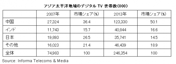 Informa Telecoms & Mediaが発行した調査報告書「Asia Pacific TV - 12th Edition」によると、2013年にはアジア太平洋地域におけるテレビ世帯の3分の1以上がデジタル放送を受信すると報告しています。また、2007年中には、中国が日本を凌ぐ最大のデジタル市場となり、2013年までにはアジア太平洋地域におけるデジタル市場総計の半数以上を占めると予測しています。